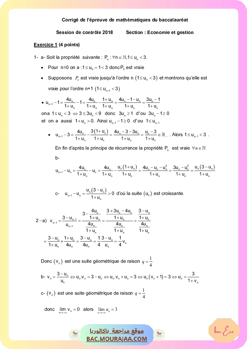 Corrigé controle math Bac 2018 – Section eco