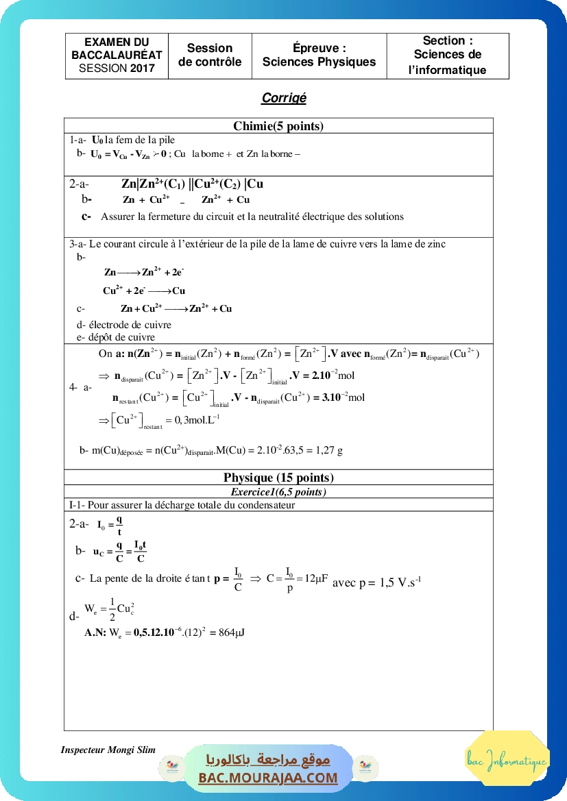 Corrigé controle physique Bac 2017 – Section info