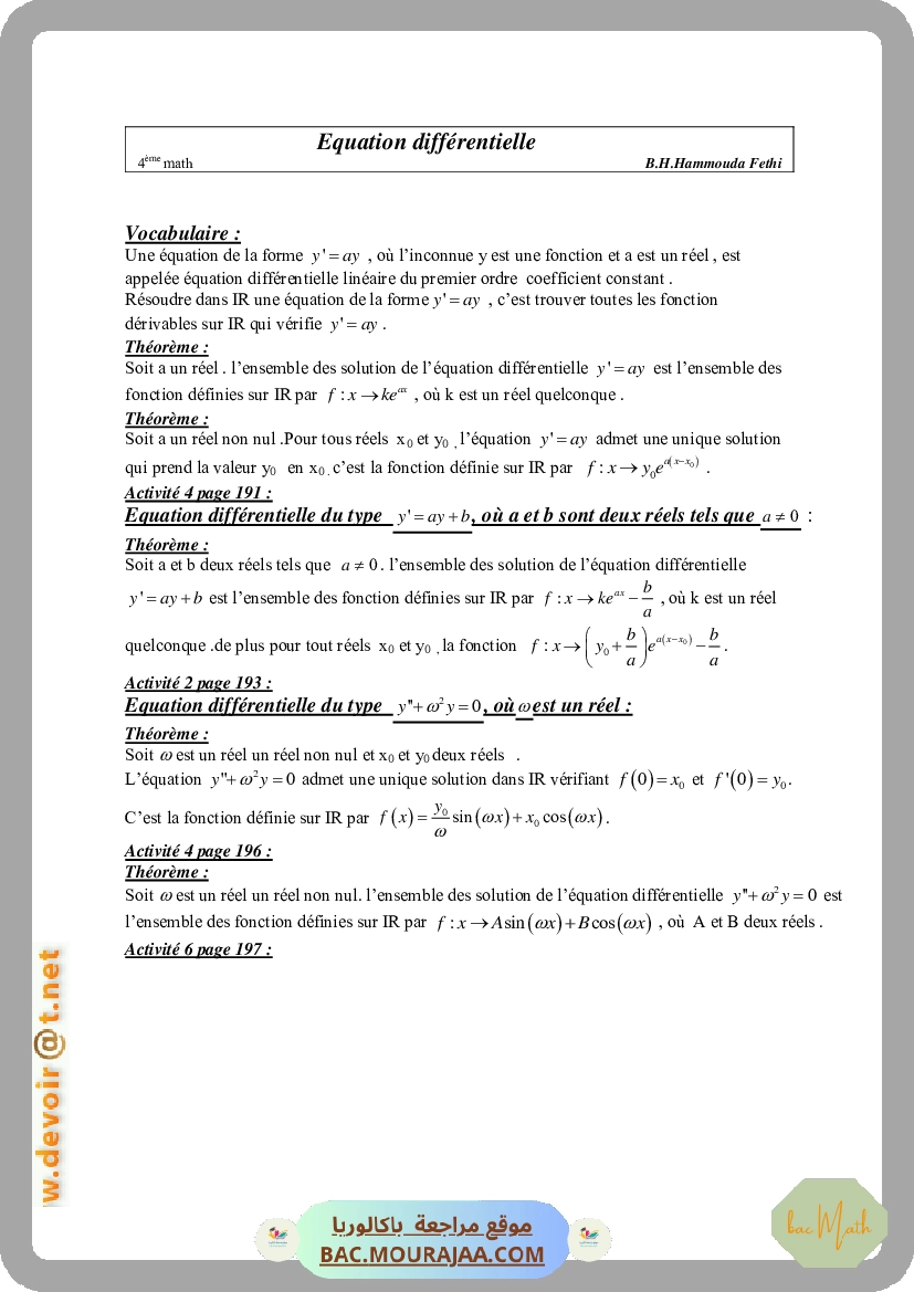 Cours Math Equation differientielle Bac Math Mr Hammouda Fethi