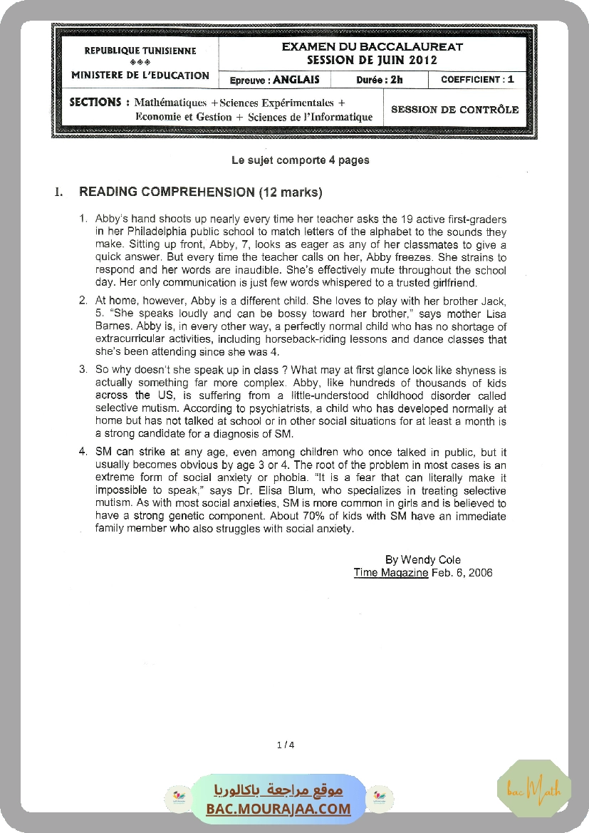Sujet controle anglais Bac 2012 – Section math