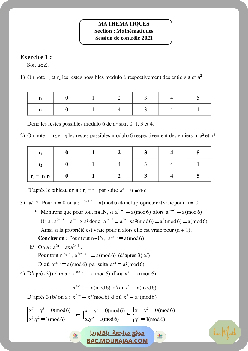 Corrigé controle math Bac 2021 – Section math