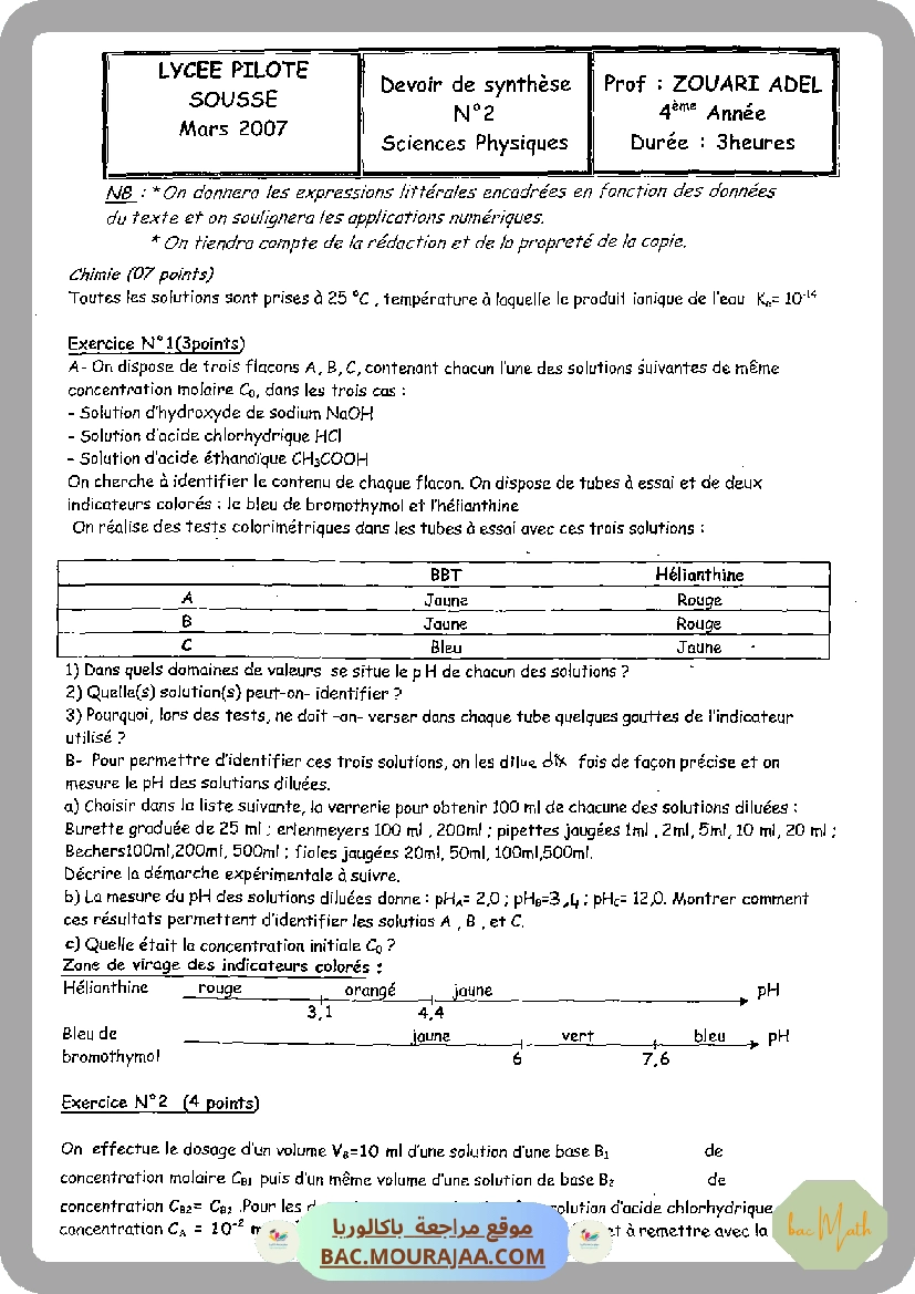 lycee pilote 50 devoir synthese 2 physique bac math