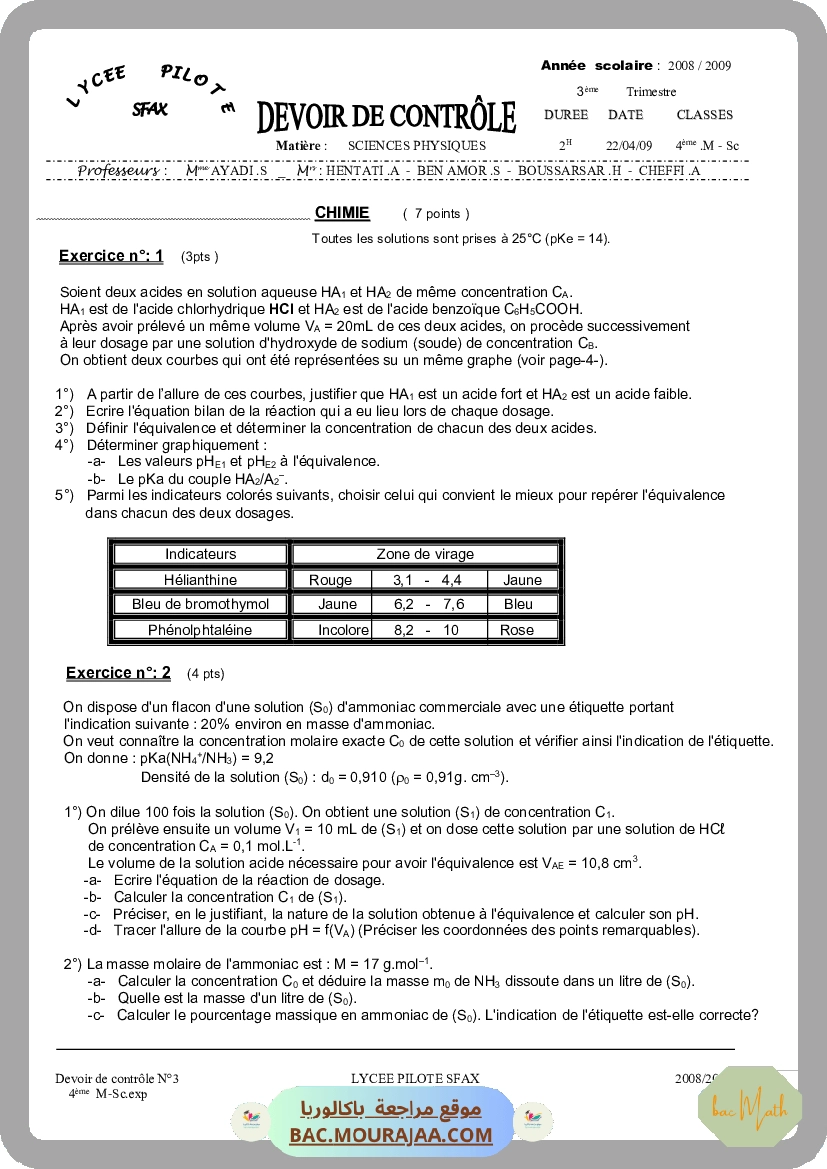 devoir corrige controle 3 physique lycee pilote sfax bac math 2009