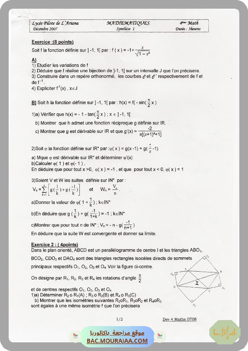 devoir corrigee lyce pilote aryana synthese 1 math bac math 2008
