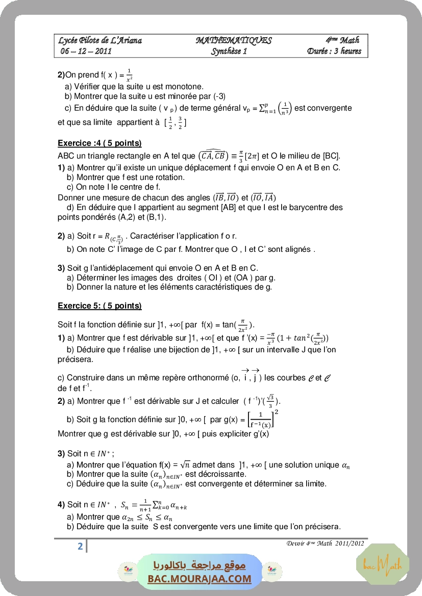 devoir corrigee lyce pilote aryana synthese 1 math bac math 2012