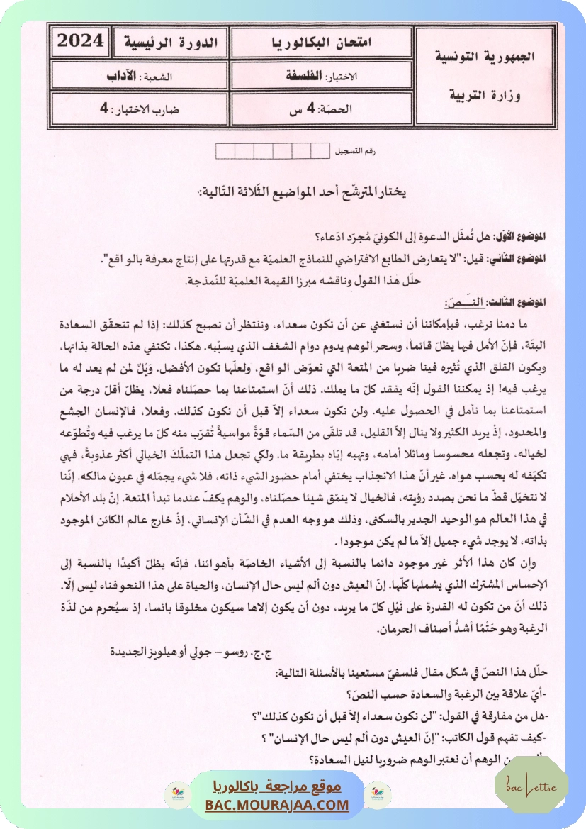 Sujet principale arabe Bac 2024 – Section lettre
