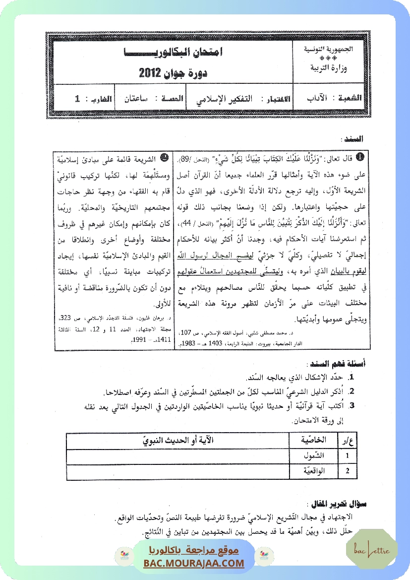 Sujet principale pense_islam Bac 2012 – Section lettre