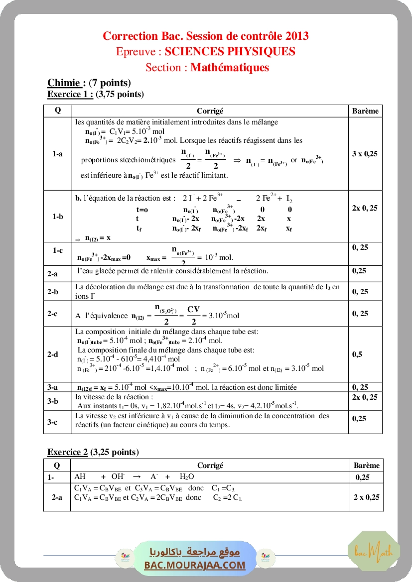 Corrigé controle physique Bac 2013 – Section math
