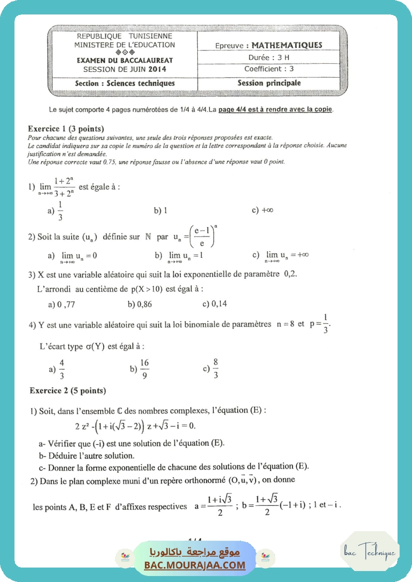 Sujet principale math Bac 2014 – Section technique
