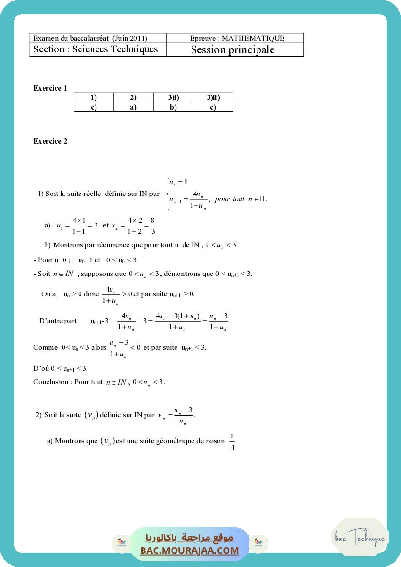 Corrigé principale math Bac 2011 – Section technique